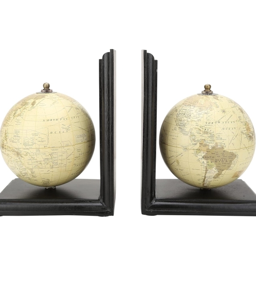 Emphasize your home, office, or love for travel with this worldly set of bookends. Preserve the tidiness of your bookshelf with help from these classic and functional globe bookends that secure your books in contemporary style. Artistically crafted of wood and metal, each brandishing a rotating globe, this set of bookends is perfect to show off your book collection in a simple, chic, and refined manner. They measure 8 in tall, 6 in long, and 5 in wide, and are crafted of wood and metal. Blending modernism with practicality, these bookends will compliment a multitude of decor styles brilliantly. A thoughtful gift for any traveler or would-be explorer of the world.